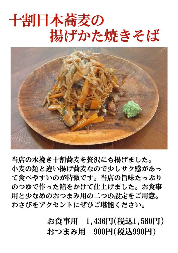 蕎麦屋ならではの料理の他に、創作料理もご用意。揚げ蕎麦のパリパリサラダ、蕎麦ピザ、鰹がっこチーズ、蕎麦プリン( コースのみ)や蕎麦ポタージュ( コースのみ) など、蕎麦屋の料理のイメージを守りつつ、他ではあまり出会うことのない料理もご提供しています。